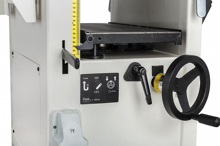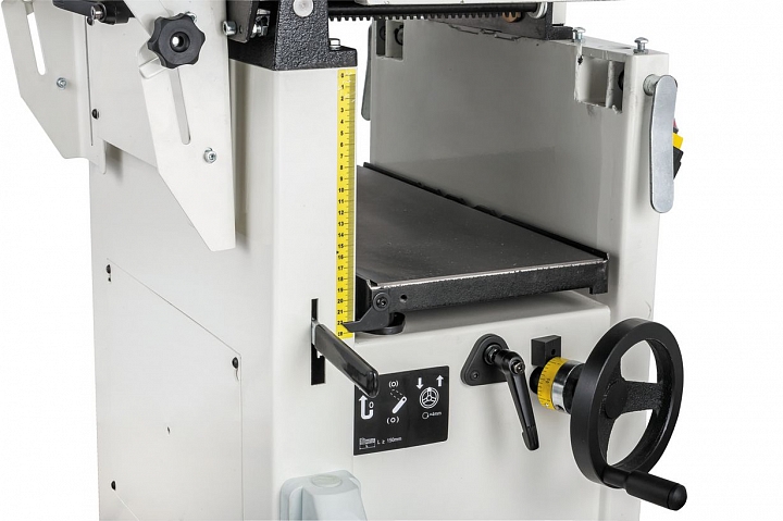 Фугование и рейсмусование производятся как обычно – каких-либо специальных приемов работы не требуется; переналадка почти не занимает времени. Верхний фуговальный модуль, объединяющий в себе оба стола и механизм регулировки глубины строгания, полностью откидывается (при этом ранее сделанные настройки не сбиваются), кожух стружкоудаления переворачивается. Компоновка с откидным верхом дает преимущества как в работе (лучше обзор, более качественно работает стружкоудаление), так и при обслуживании строгального вала, доступ к которому ничем не затруднен.