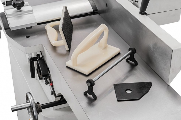 Оба стола регулируются по высоте при помощи винтовых механизмов, приводимых в действие ручками-маховиками. Перемещением подающего (переднего) стола устанавливают глубину строгания, для чего есть соответствующая разметка; принимающий (задний) регулируют только во время обслуживания станка при наладочных операциях. Упор заготовки чугунный, с механизмом наклона (он возможен в обе стороны). Фиксация выбранного положения производится резьбовым зажимом. Ножевой вал укомплектован тремя ножами, допускающими повторную заточку. Их типоразмер и ассортимент такой же, как и у профессиональных фуганков Jet с аналогичной шириной строгания.
