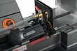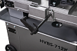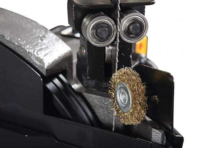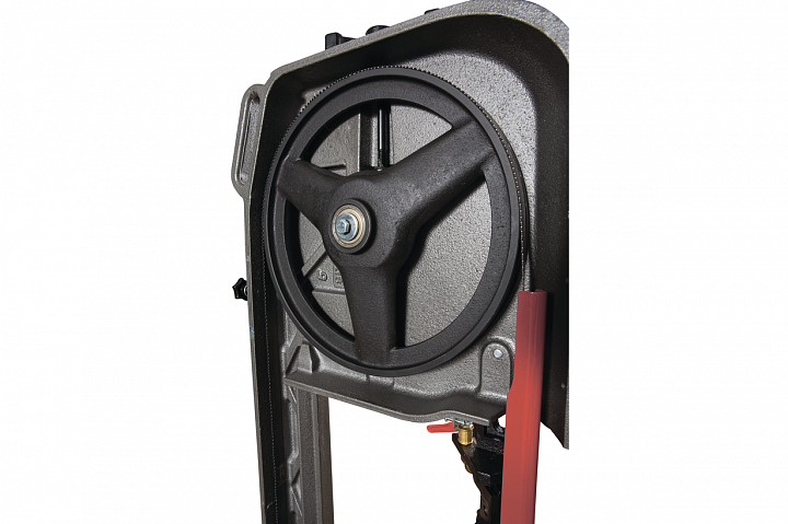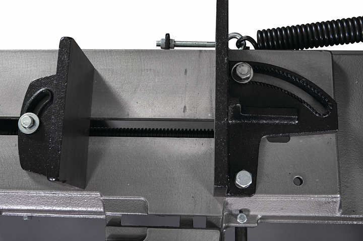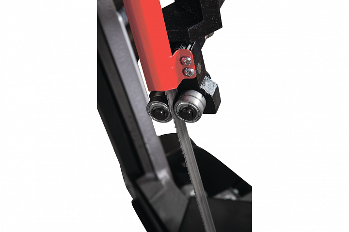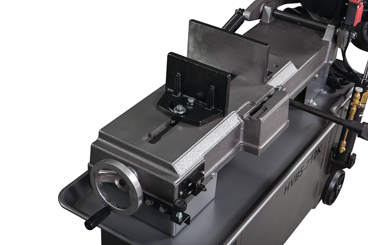 Модель HVBS-712K имеет направляющие, передвигающиеся по консоли. С помощью направляющих можно установить оптимальную величину прохода пилы, повышая качество распила и увеличивая срок эксплуатации ленточного полотна. Направляющие оснащены 5 подшипниками, регулирующими позиционирование ленточной пилы относительно обрабатываемой заготовки, обеспечивая точность распила. На нижней части пильной рамы установлены диск очистки полотна от стружки. Станок оборудован системой подачи СОЖ непосредственно в зону резания. Натяжение ленточного полотна регулируется вручную.