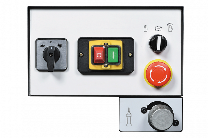 Ленточнопильный станок оснащен экономичным мощным электродвигателем – 0,75 кВт. Наличие в конструкции моторной группы устройства для смены количества полюсов, обеспечивает работу станка в режиме 2-х скоростей – 35 и 80 м/мин. Управление работой станка осуществляется с помощью панели управления. Для удобства работы оператора на ручке консоли имеется кнопка включения работы двигателя. Модель оборудована кнопкой аварийной остановки двигателя, имеет тензометр, с помощью которого можно регулировать силу натяжения ленточной пилы.