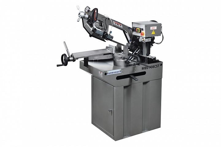 Модель MBS-708CSТ является ленточнопильным станком, выполненным по европейскому типу, с поворотной рамой. Станок оборудован системой гидроразгрузки, обеспечивающий легкое поднятие и опускание тяжелой, литой консоли. Наличие гидроцилиндра создает необходимое прижимное усилие пильной рамы на обрабатываемую заготовку. Ленточный станок предназначен для использования в заводских условиях, для массового серийного производства и мелких ремонтных работ. Конструкция рассчитана на распил круглых заготовок максимальный диаметром 175 мм. Поворот рамы осуществляется в соответствии с показаниями шкалы, в диапазоне 0-60 0.