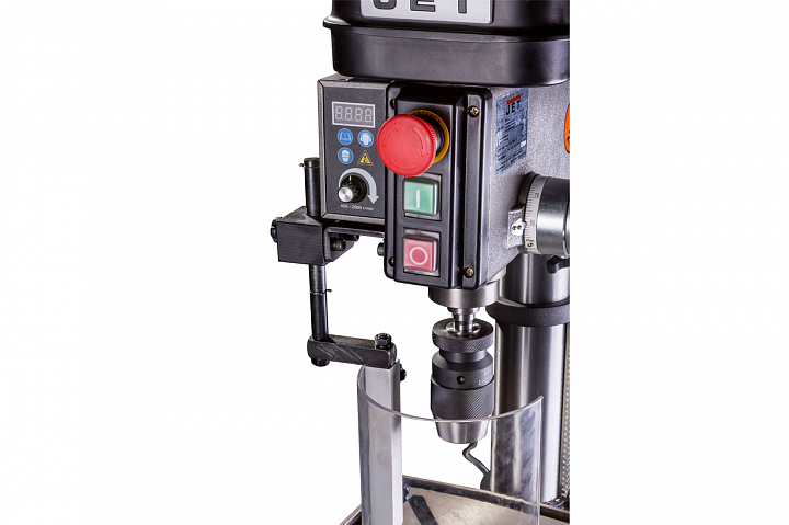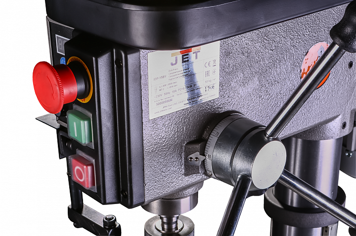 Настольный сверлильный станок JET IDP-15BV предназначен для сверления металлов, дерева и даже пластика. Данный станок относится к классу профессиональных станков и позволяет сверлить отверстия до 16 мм в стали и до 20 мм в чугуне. Главной особенностью станка является плавная регулировка скорости вращения шпинделя, регулируется от 450 до 2000 оборотов в минуту. Плавную регулировку обеспечивает плата управления. На станке установлен коллекторный двигатель вращение на шпиндель передается через шкивы и ремень. Регулировка скорости осуществляется на лицевой панели станка с помощью барашка.