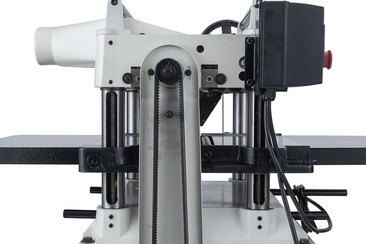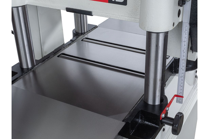 Сверху направляющих колонн установлено два металлических ролика для обратной подачи заготовок. Рабочий стол станка, его удлинения, основание и строгальный узел сделаны из чугуна. Регулировка просвета происходит при подъеме и опускании стола, в нижнем положении расстояние до ножей превышает 200 мм, что позволяет пропускать крупные брусья или доски, поставленные на ребро.