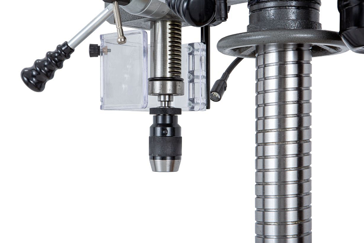 Ход пиноли шпинделя составляет 85 мм. Для контроля глубины сверления предусмотрена шкала на лимбе с миллиметровой разметкой, а также стопорный зажимной винт для ограничения хода пиноли.