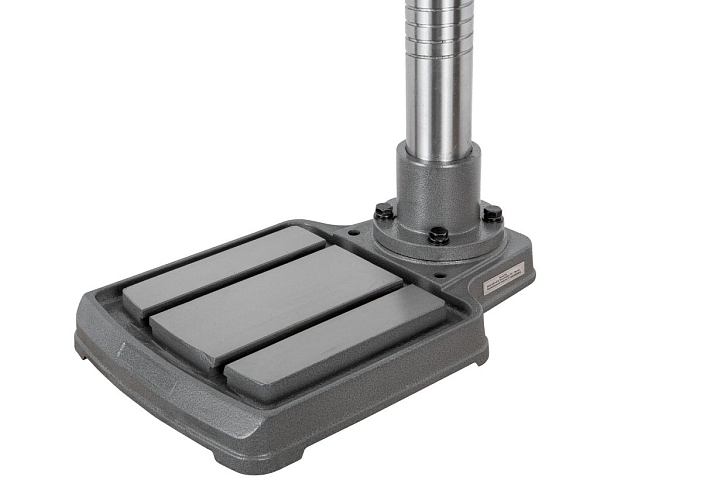 Станок имеет устойчивое чугунное основание размером 490 x 310мм, с рабочей поверхностью стола 238 х 240мм, на которой предусмотрены 2-Т образных паза с шириной 14мм, для установки тисков или других зажимных приспособлениями. Расстояние между пазами 120мм. На основание установлена колонна диаметром 70мм с винтовой канавкой для возможности перемещения сверлильной головы по вертикали. Максимальное расстояние между шпинделем и столом-основанием, составляет 540мм.