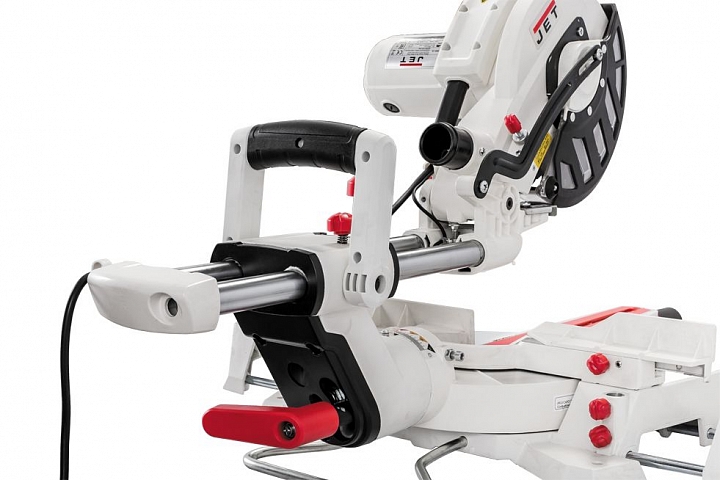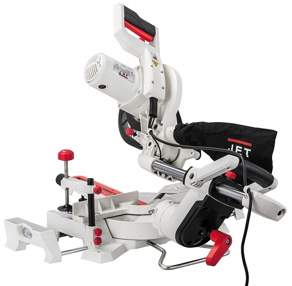 Торцовочно-усовочная пила Jet JSMS-8L имеет все необходимые функции распиловки с поворотом / наклоном и в дополнение к этому оснащена механизмом протяжки. Он обеспечивает продольный ход пильной части, благодаря чему больше длина реза и, соответственно, ширина распиливаемых за один проход деталей (она достигает 305 мм). Кроме того, возможность протягивать пилу может быть использована для нарезки шипов с края заготовки (усовки) и для выполнении глухих пазов (глубину при этом ограничивают регулируемым упором).